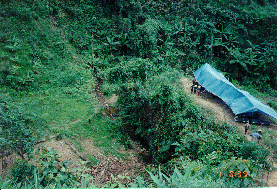 STANDING ON THE SITE LOOKING DOWN, WE KEPT OUR SUPPLIES AND EQUIPMENT UNDER THIS HOMEMADE CANOPY. TO THE LEFT OF IT IS THE VERY BOTTOM OF THE VALLEY FLOOR. THIS WAS THE AREA WHERE THE SEAT WAS FOUND.