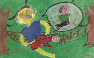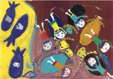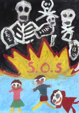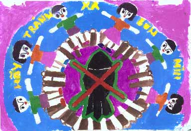 | Lee Lee leepainter@hotmail.com is setting up a collaboration of American and Vietnamese artists to create a set of murals for a new landmine education center built by PeaceTrees Vietnam in Dong Ha town (Quang Tri Province). The above art work was created by a group of Vietnamese children who live in the city of Dong Ha. |