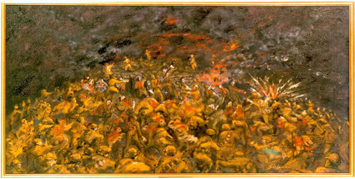 | "O. P. Frisco" Oil (29" x 46") 1998 Commissioned by one of the two survivors of the 29 Marines overrun by over 300 Chinese Troops in Korea on October 6th, 1952. In the collection of the Marine Corps Historical Museum in Washington, D.C. |