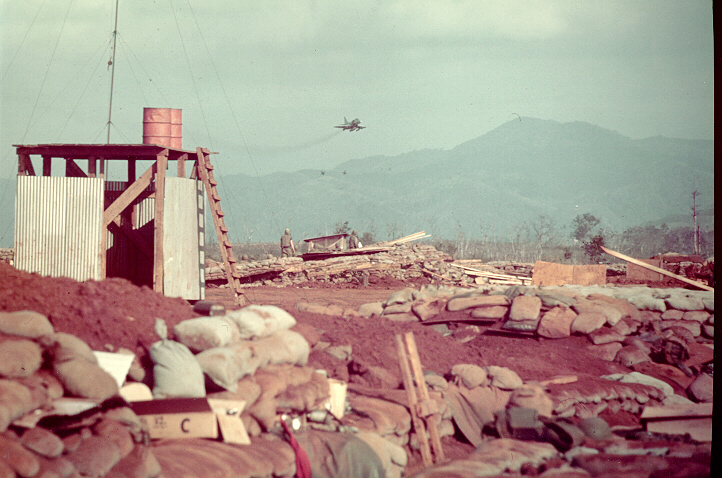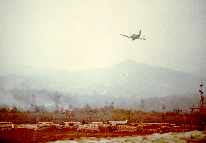 A1E bomber making a napalm drop on NVA trenches 100 meters outside the lines of Khe Sanh