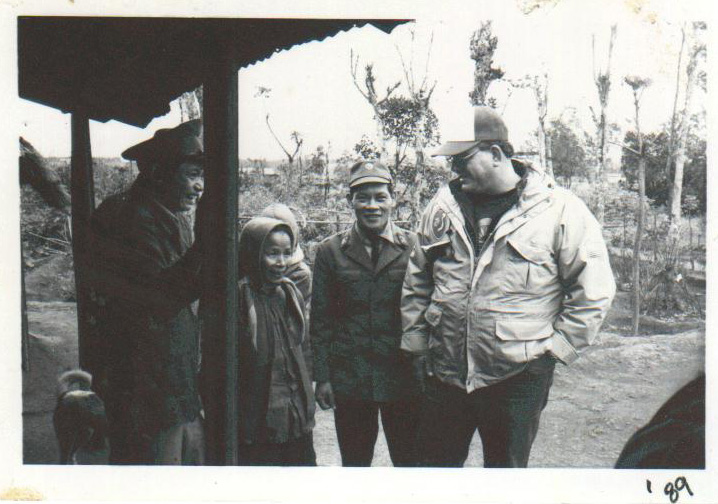 This second picture was taken on a return visit to the area in 1989. The man on the left wearing a hat is the little boy being carried in the 1968 picture. The woman carrying him is his mother and is shown again in the 1989 picture, along with Mike Wallace and other members of the Vietnamese family.