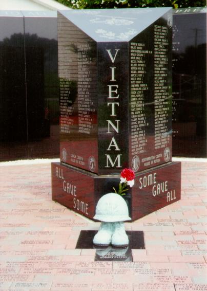This obelisk contains the names of the 127 men killed and missing during the war. The left side is inscribed with the 54 men from Lehigh County. The right side honors the 73 men from Northampton County, ergo the name Lehigh-Northampton Vietnam Veterans Memorial. The sculpture of the Helmet and Boots was done by Bob Peters, a local sculptor from Macungie.