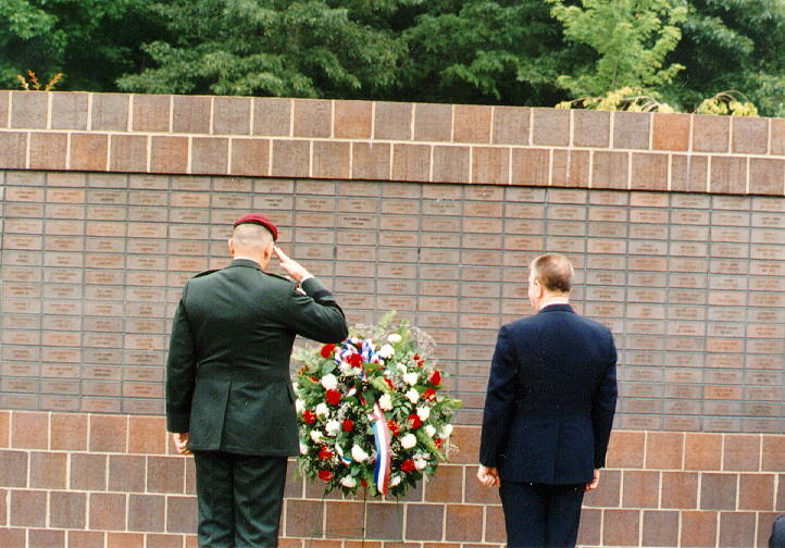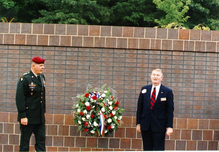 Here are four recent pictures of the Memorial submitted by Doug Maston. They were taken at a wreath laying ceremony on Memorial Day, 1996. The Secretary of the Army, Togo West was scheduled to lay the wreath, but his plane was fogged in at National Airport in D.C. Instead, the Commanding General of Fort Bragg, NC (Lt Gen John M. Keane) laid the wreath. These photos are .jpg files.