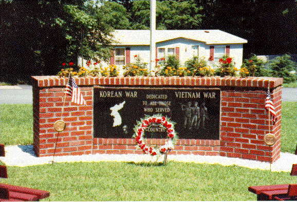 This photograph, taken in August 1994, shows the second of two curved brick walls in a small grassy expanse in Hadley, New York. The first structure honors veterans of the World Wars, and this one is dedicated to those who served in Korea and Vietnam.