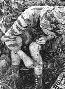 "While in the jungles, cuts or scratches became infected and turned into painful sores. We referred to these sores as jungle rot. At one time, while I was a point man for the L.R.R.P.s, I was bandaged from both wrists to elbows and both ankles to knees."