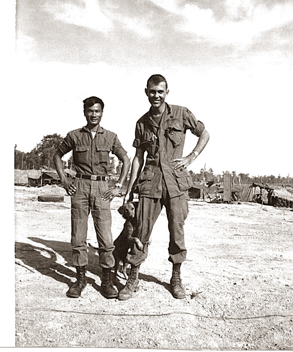 Tuc (at left), an ARVN regular, and I, with Ruby affectionately attached to my leg, in December 1967