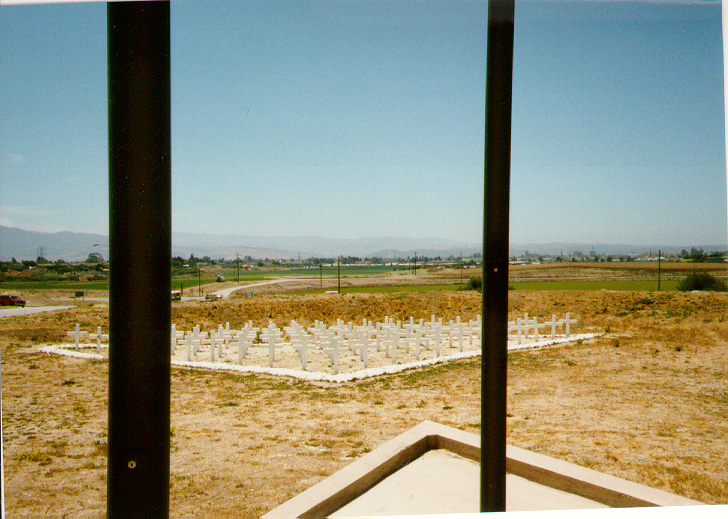 A picture showing the "cemetary" with the crosses and the U.S. and POW flags the flags are somewhat tattered and need to be replaced