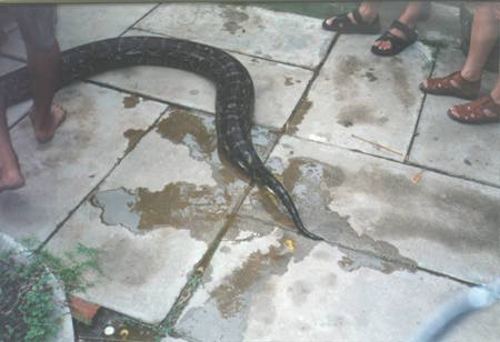 Just after the meal was served, four locals carried in a python weighing a couple hundred pounds and measuring 10 or more in length. They had the courtesy to drop it on the floor in the center of the cafe (as opposed to dropping it on anybody's table), and it proceeded to make its way around the premises.