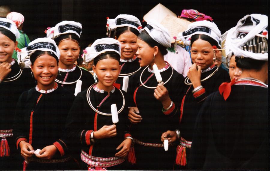 This group of young girls is enjoying popsicles. They are of the minority tribe San Chi, as distinguished by their dress.