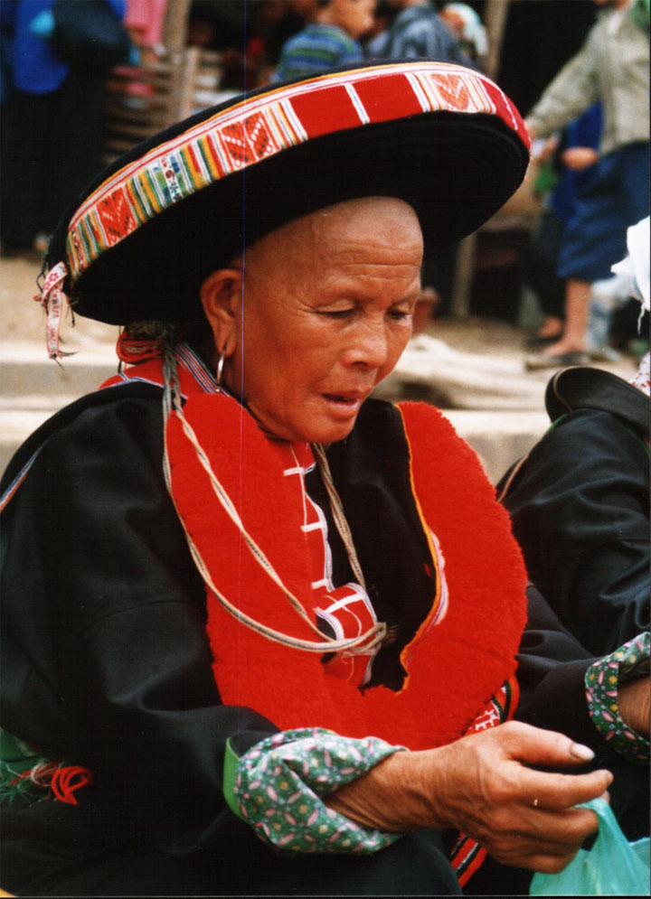 This is a Red Dzao lady. Because she is from a rich and powerful family, she has a right to wear the big hat. The Red Dzal Tribe lives in the mountain regions in northern Vietnam. In each area, they dress a bit differently, but all use red color to decorate their clothing (and thus the Tribal name Red Dzao). Also, the Red Dzao have a habit of shaving their hair and eyebrows. For them, that is beauty.