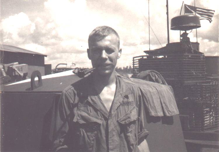This was taken on the bow of a Monitor. The object right behind me is a turret with a 40 mm Bofors gun in it and a big white star painted on the top. Right behind that is the well deck with what looks like the Naval version of the 81 mm mortar with a pile of laundry on. The pipe I have clenched in my teeth was an attempt to make me look more studious. I'd smoked a pipe in college every so often. No one ever questioned if tobacco was the only thing I smoked in it (it was). This was probably taken during my last attempt to quit cigarettes before I went home.