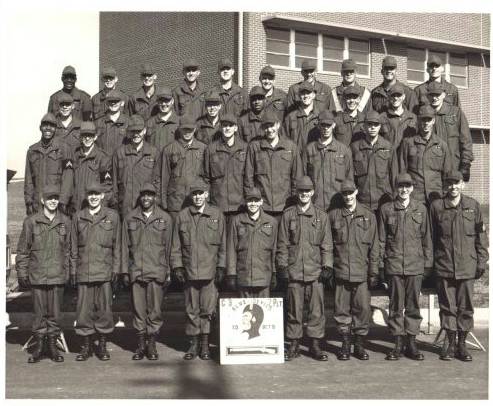 This is my basic training company at Fort Leonard Wood. I'm the guy on the left end of the third row. Although you can't see them, I had Acting Sergeant stripes on, too. I got them by going through the Leader's Orientation Course before Basic training. My title was Assistant Platoon Guide. I had a private room in the barracks that I shared with 37 M14 rifles. Every morning, as soon as the PA system blasted Reveille, I had to hand them out; and every night, I had to collect them. The smell I remember most from Basic is of the cleaning solvent and gun oil. I walked to the right front of the column when we marched.