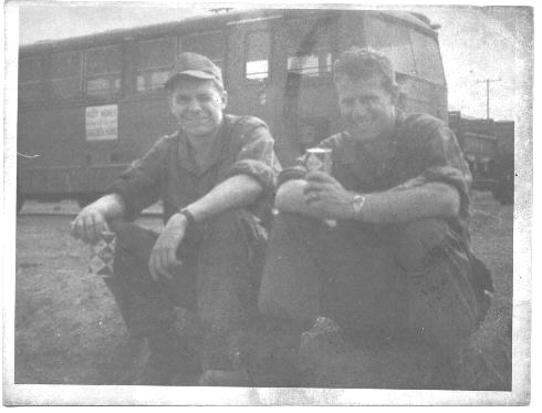 I wish I could remember this guy's name! I'm the one on the left with the hat on. I only saw busses like that one in the background around Saigon, Long Bin, and Ton San Nhut. I was in Saigon a few times but only twice at Long Bin and Ton Son Nhut, to and from Vietnam. Those are pre-poptop Coke cans we're holding. Remember church keys? You're showing your age.